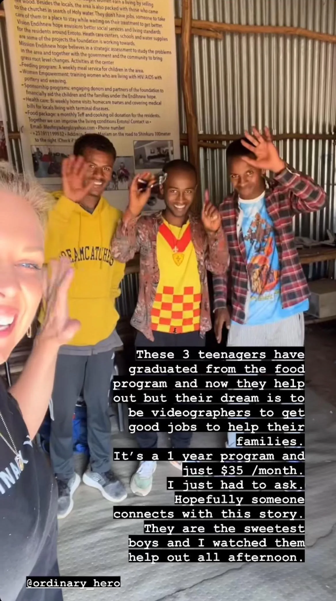 The three young men are some of our greatest volunteers at our feeding program on Entoto Mountain. They are interested in attending videography school for $35/month, a one-year commitment.